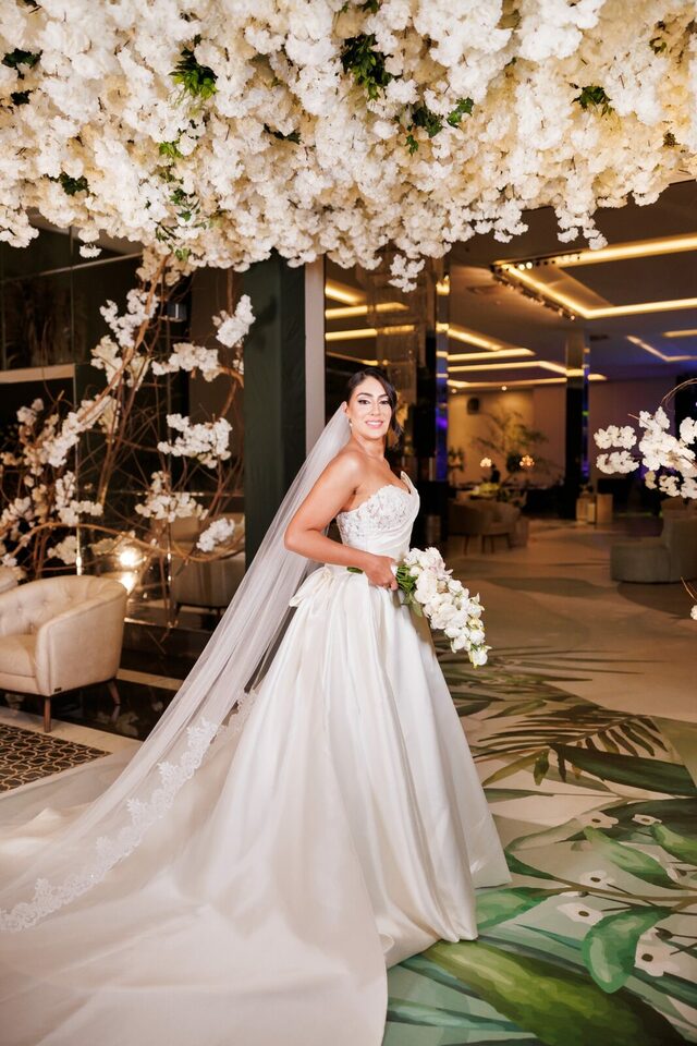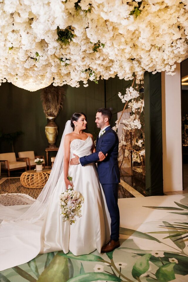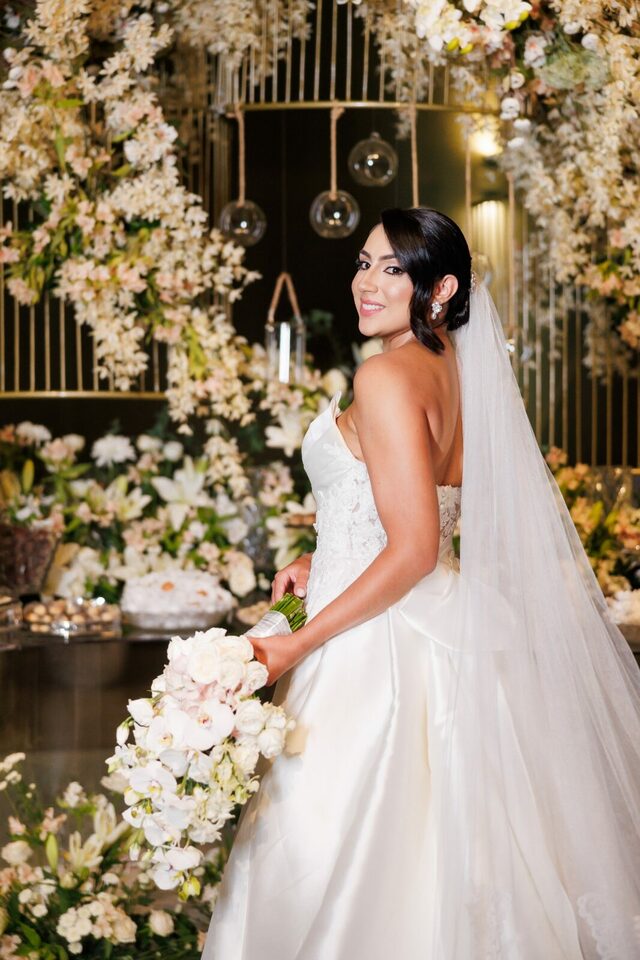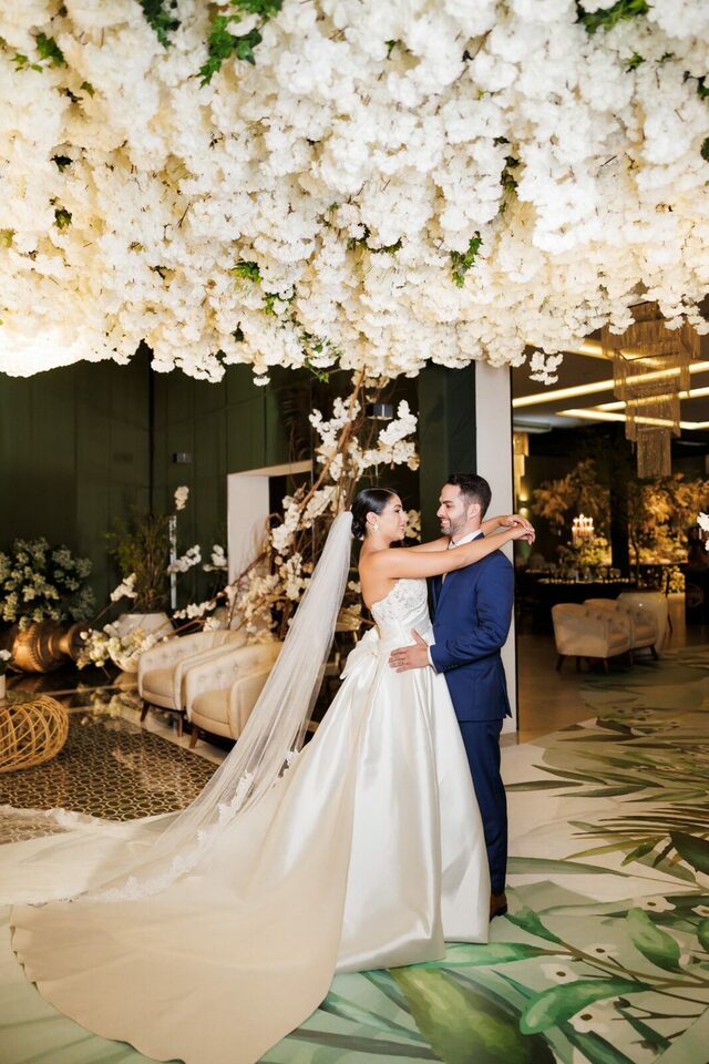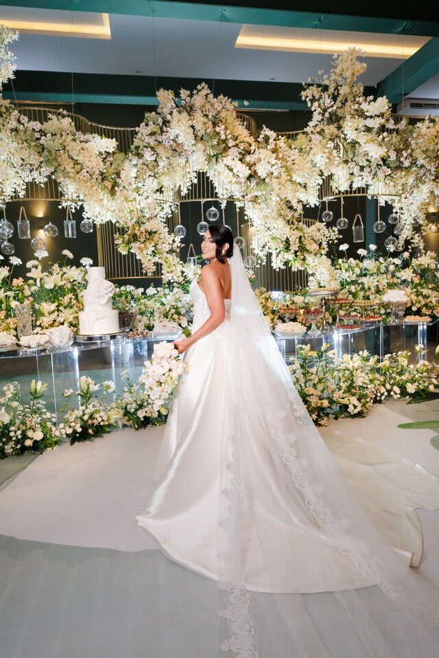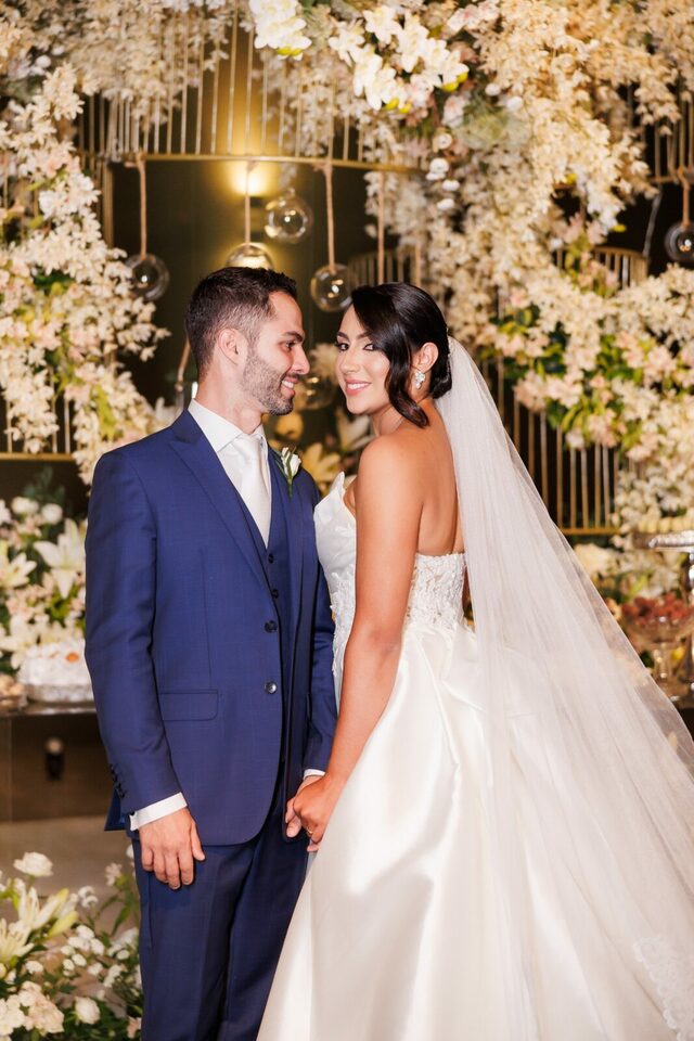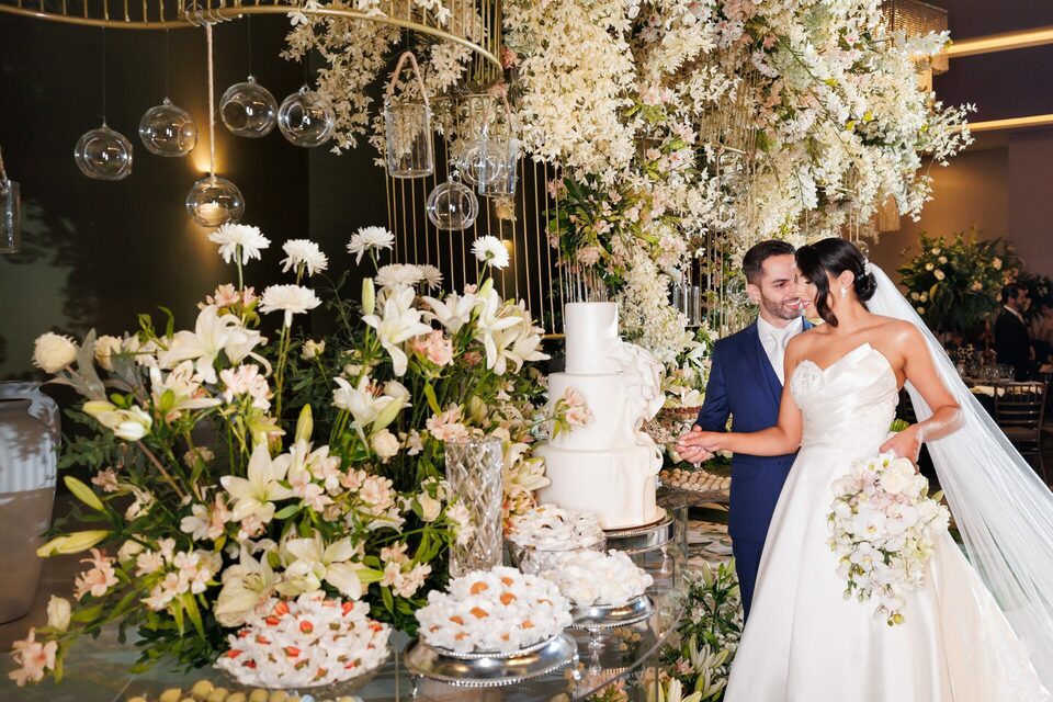 Após a cerimônia, os convidados foram recebidos no deslumbrante Mourão Garden, onde um teto de flores brancas na entrada deu as boas-vindas a todos, criando um ambiente mágico e acolhedor. A recepção foi marcada por risos, danças e muita animação, refletindo a felicidade contagiante de Loraine e Maikon.