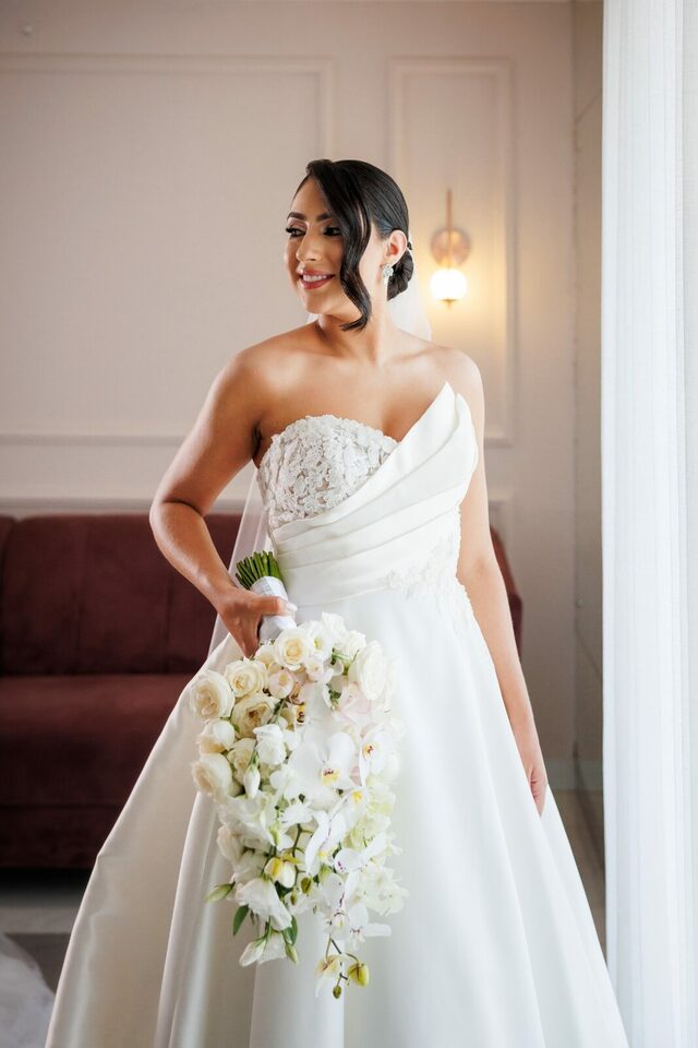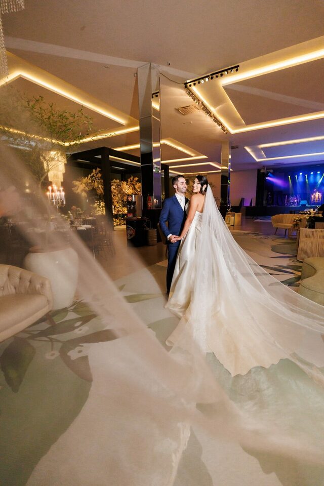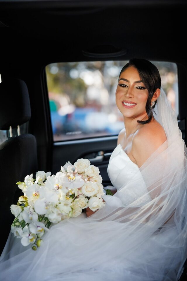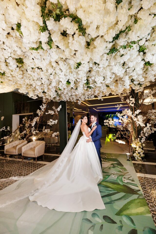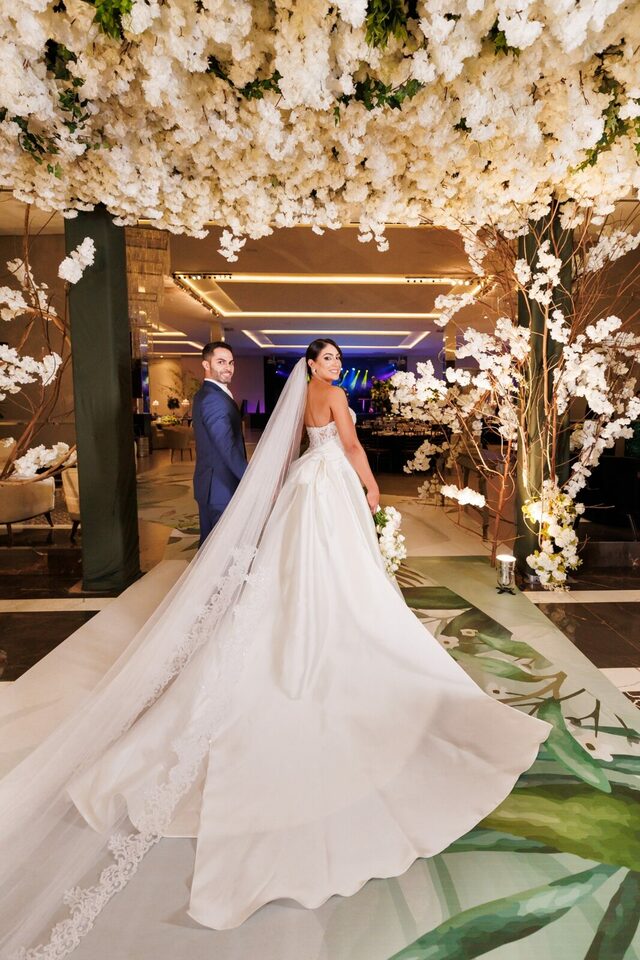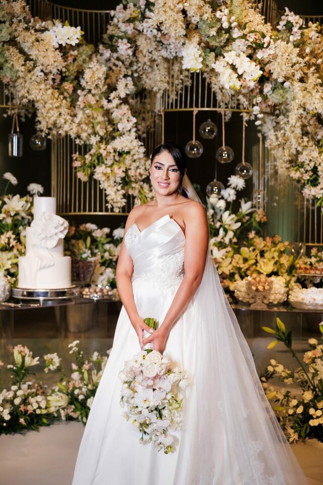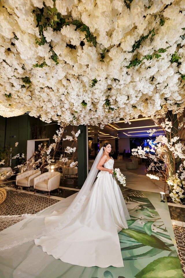 Após a cerimônia, os convidados foram recebidos no deslumbrante Mourão Garden, onde um teto de flores brancas na entrada deu as boas-vindas a todos, criando um ambiente mágico e acolhedor. A recepção foi marcada por risos, danças e muita animação, refletindo a felicidade contagiante de Loraine e Maikon.