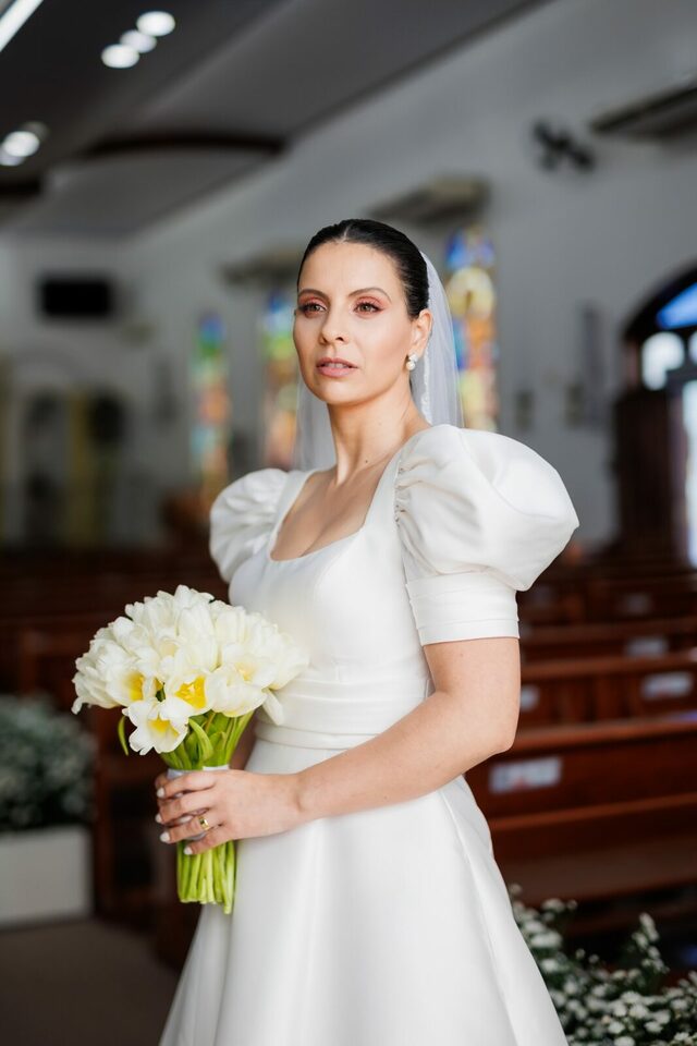 O cabelo preso em um lindo coque, a maquiagem suave e os brincos delicados pareciam dar um toque final à beleza natural de Maiara. Ela estava perfeita! Véu, vestido e buquê, uma composição irradiante para o grande dia. Cuidadosa, Maiara fez uma bride session na semana anterior, para ter calma e cuidado na preparação. No dia, ela se aprontou com a mesma atenção duas horas antes da cerimônia. Afinal, não há motivos para atrasos quando o amor da sua vida está à sua espera.